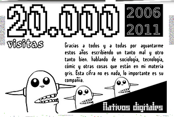 Cuando inicie esta aventura al lado de mi amigo Miguel en el año 2006, nunca pensamos en tener muchas visitas, en mi caso no escribí para eso. Tampoco lo hice por los comentarios y las discusiones que se podrían plantear lo que me impulso hacer esto fue el sentido de la libertad de opinión e información sobre temas que yo presuntamente podría dominar como persona. La cifra 20.000 supone mas o menos entradas de ustedes, pero para mi es mi historia en un intento por ser bloguero y eso me trae gratas recordaciones.