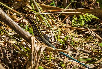 Un ejemplar juvenil de ameiva centroamericana luciendo sus colores junto al camino. Los adultos son de color marrón.