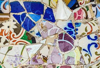 Relata una anécdota de la vida de Antoni Gaudí que éste, de visita en el taller del ceramista Lluís Brú y al ver como colocaban las piezas en un mosaico, agarró una baldosa y una maceta y rompiéndola exclamó: «A puñados se tienen que poner, si no, no acabaremos nunca». Así nació la técnica del trencadís. Se utilizaba material desechable de la fábrica Pujol i Bausis, emplazada en Esplugas de Llobregat, además de fragmentos de platos y tazas de café de loza blanca de diversa procedencia.