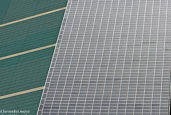 Fotografía tomada desde ultraligero volando por encima de una nave con paneles solares en Villanueva del Pardillo, Madrid