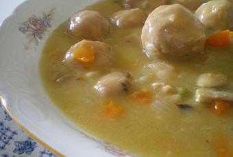 Cortamos y picamos fina la cebolla, la zanahoria en rodajas y los champiñones los laminamos.Freímos en una cacerola todo el conjunto hasta que la cebolla se dore.Añadimos la cucharada de harina.Tostamos un poco y acto seguido incorporamos el caldo de carne, removiendo un poco para integrar.Agregamos ahora las albóndigas fritas y los guisantes, dejando cocer todo el conjunto 10 minutos.
