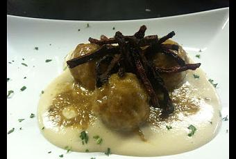 Cortar en brunoisse y pochar la cebolla junto con el ajo. Poner la carne en un bol y adicionar la cebolla y el ajo pochados, el huevo, el mousse de oca, y el queso cortado en cubitos pequeños. Se salpimeta y se hace una mezcla con todos los ingredientes.