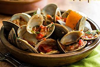 Incluye moluscos en tu semana de pescados y mariscos. Las almejas son ricos en ácidos grasos Omega 3, bajo en calorías, y muy altos en hierro.RECETA DE ALMEJAS AL VAPOR EN SALSA PICANTEINGREDIENTES :4pers - 200/250gr de almejas2 cucharadas de aceite de oliva virgen extra1 taza de vino blanco seco1 cebolla pequeña 4 dientes de ajo, picados1/4 a 1/2 cucharadita de hojuelas de pimiento rojo1 (28 onzas) de tomates picados en jugo1/4 cucharadita de azúcar1 tira de cáscara de naranja1 cucharadita de hojas de tomillo fresco o 1/2 cucharadita de tomillo secoSal y pimienta recién molida al gusto3 a 4 cucharadas de perejil picado fresco o cilantroUnas gotas de jugo de limón (opcional)Una pizca de azafrán (opcional)PREPARACIÓN :1.Lavar las almejas en varios cambios de agua y frotar con un cepillo pequeño, (como un cepillo de dientes).Desecha las que estén abiertas o que se han agrietado.