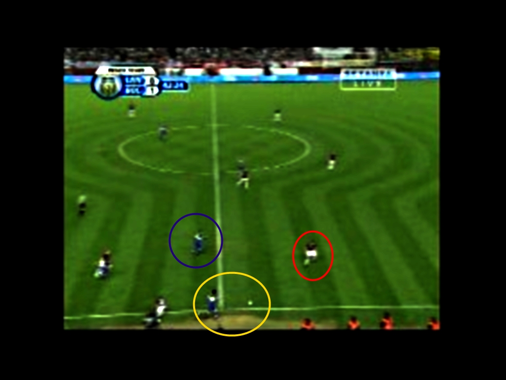 Me detengo en un pequeño detalle que define la inteligencia y la concentración de un jugador, en este caso Roncaglia. El anticipo es muy bueno, pero observen después a Roncaglia, marcado con el círculo amarillo, el modo en que le gana un segundo de reacción al marcador de Lanús, marcado con rojo, y la importancia de tener un compañero cerca aunque no recibiera el pase, aquí marcado con azul. Roncaglia amaga sutilmente a dar el pase al azul, de manera que el rojo modifica la actitud corporal y detiene lo que iba a ser un arranque en la carrera por detener a Roncaglia. Sin embargo, Roncaglia no da el pase y continúa. Excelente jugada del lateral derecho de Boca.