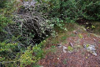 Justo en el punto exacto donde el mapa topográfico del ICGC sitúa el castell de Pena, el suelo se abre en una profunda depresión que desciende entre la maleza y las rocas cubiertas de musgo. No es una simple hondonada natural: la forma y las dimensiones de este hueco sugieren que aquí, efectivamente, hubo algo más que bosque.