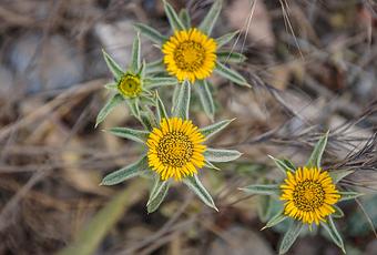 Otra planta con un sinfín de nombres vulgares: amelos duros, árnica, árnica de secano, asterisco, castañuela, cebadilla, cevadilla, estrellada, estrellada espinosa, falsa árnica, inguinaria, madre e hija, malhijo, mata del reloj, mirra, ojo boyal, ojo de buey, padres e hijos, pampilosa de espinas, patagallo, pincho, pincho amarillo, pincho cuco, pincho de las diarreas, uña de gato.