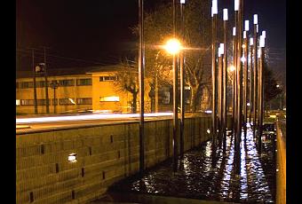 A mi me parece una intervención de lo más acertada, primero por que no "entra a saco" y varía completamente el trazado de un parque o avenida ya planteado si no que intenta adaptarse al él. Y segundo porque con pocos elementos y sencillos como son las farolas de luz a modo de representación más "espiritual" de todas esas personas y el talud con los nombres algo más socorrido a la hora de hacer este tipo de homenajes, se crea un pequeño espacio para que nunca se olvide a esas personas.