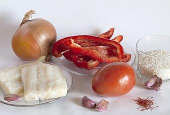 Ingredientes para cuatro personas 400 gr de arroz 300 gr de bacalao Una cebolla Un pimiento rojo Un tomate maduro Tres dientes de ajo Unas hebras de azafrán Un vasito de vino blanco Sal Aceite de oliva