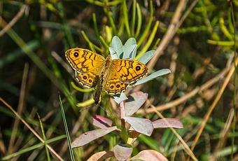 Una pareja de mariposas saltacercas (Lasiommata megera) en pleno "acto". La hembra mantiene las alas abiertas mientras el macho permanece enganchado a ella con las alas cerradas.
