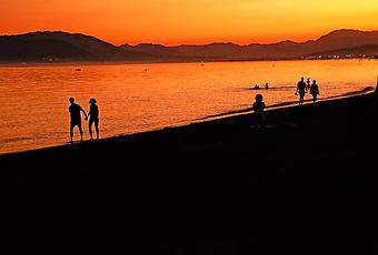 Escena a contraluz en un atardecer de playa de un verano Covid, con muy poca gente,