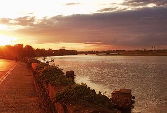 Atardece en el río Loira con sus barcas que lo recorreny en la carretera que discurre paralela