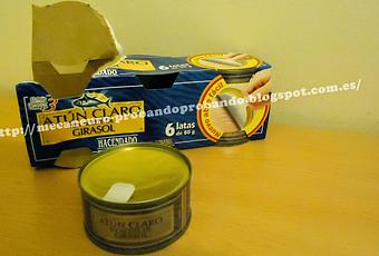 Este atún se vende en packs de 6 latas, cerrados por un cartón de color azul oscuro (lo diferenciaremos del atún con aceite de oliva de la misma marca por el color del pack).En este cartón podemos leer el tipo de producto del que se trata, la marca que lo comercializa y la marca que lo fabrica, los valores nutricionales y otras características a tener en cuenta, como su ingrediente Omega 3 y su fecha de caducidad.Dentro de este paquete nos encontramos con las 6 latas en filas de tres, una encima de la otra. Las latas son de metal y alrededor de su cuerpo podemos volver a leer el producto del que se trata y su marca. Cada lata contiene un abrefácil, para abrirlo solo tenemos que tirar de una pequeña pestañita que contiene en su parte superior. Aunque aún siendo abrefácil, hay veces que cuesta bastante, sobre todo con manos mojadas y/o aceitosas.En el interior de cada lata encontramos el atún con el aceite. Deberemos removerlo con un tenedor para poder sacarlo, pues está metido de manera compacta.