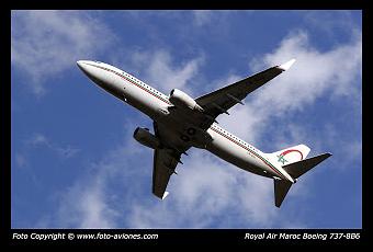 El avión de la fotografía de la izquierda es un Boeing 737 Next Gen, perteneciente a la compañía aérea de Royal Air Maroc, fue fotografiado el día 14 de Junio de 2016 a las 19:45 horas momentos después de despegar del aeropuerto Adolfo Suárez Madrid - Barajas con número de vuelo AT971 destino CasablancaEste avión empezó en la compañía aérea de Royal Air Maroc el 8 de marzo de 2005.