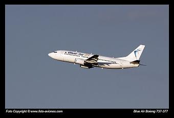 El avión de la izquierda es un Boeing 737, perteneciente a la compañía aérea de Blue Air, fue fotografiado el día 30 de Mayo de 2015 a las 20:35 horas momentos después de despegar del aeropuerto de Madrid-Barajas.Este avión empezó en la compañía aérea Ansett Airlines el 22 de agosto de 1896 con matrícula VH-CZA.