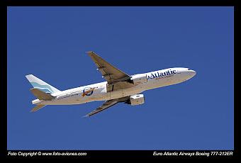 El avión de la fotografía de la izquierda es un Boeing 777 perteneciente a la compañía aérea de Euro Atlantic Airways, fue fotografiado el día 13 de Agosto de 2015 a las 13:19 horas, momentos después de despegar del aeropuerto Adolfo Suárez Madrid-Barajas.Este avión empezó en la compañía Singapore Airlines el 18 de junio de 1998 con matrícula 9V-SRA.