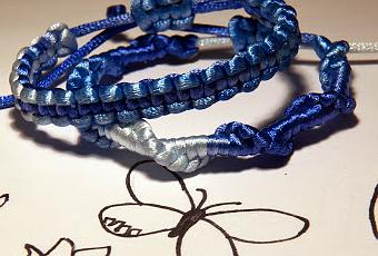 Hoy os traigo una cosa sencilla (todavía estoy preparando las novedades), una pulsera realizada a mano, con nudo plano macramé y otra nudo festón, para ambas pulseras he utilizado hilo de cola de ratón degradado en azules y con nudo corredizo ¡una monada! ¿con cual os quedáis? Debéis disculpar la calidad de las fotos, pero es que con estos días de lluvia que hemos tenido, no he podido utilizar la luz natural y he tenido que improvisar un pequeño "estudio de fotografía", y si las retoco estropeo mucho el color original del hilo...