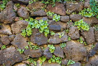 Los "barretets" u ombligos de Venus (Umbilicus rupestris) crecen entre las piedras de los muros. En este caso me llamó la atención el contraste del intenso verde de las hojas con el tono oscuro de las piedras de origen volcánico de este muro.