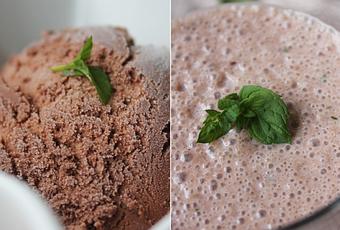 - Ponemos el plátano cortado en cachos gorditos, el helado, la leche y unas hojas de menta en la batidora y batimos hasta que quede una masa homogénea. Servimos y disfrutamos!