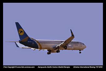 Este avión, modelo Boeing 737, perteneciente a la compañía aérea de Ukraine International Airlines, fue fotografiado el día 12 de Enero de 2015 a las 12:45 horas, momentos antes de aterrizar en el aeropuerto Adolfo Suárez Madrid-Barajas.Tipo: 737-8HXPrimera fecha de vuelo: 08/07/2009Motores: 2 CFMI CFM56-7B26Revista Fotografía