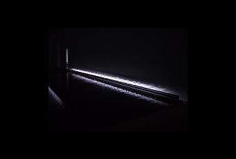 Y en el camino entre estas dos salas, vemos un guiño. Al fondo, una linea de luz como proyectada en la pared.Si caminas a la sala paralela, descubres que esa linea, el reflejo que atraviesa una fina linea cortada en la pared. Bajo esa linea cortada,hay agua. Un pequeño canalito. Frente a esto, otro foco que sabiamente cubierto, solo deja escapar un halo de luz que alcanza la instalacion mencionada. Al final del canalito, hay un camino de maderas y a medio camino, una puerta abierta hacia la sala donde vemos el reflejo en la pared.