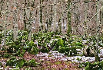 Apenas cayeron unos copos de nieve, el verde musgo se cubrió con una pequeña capa que aún si cabe lo resaltaba más, las hojas caídas y posadas plácidamente en el suelo vieron con la nieve matizar sus tonos naranjas de sequedad, formando un manto de pequeñas estrellas que cubría casi todo. Era ya el momento de que vinieran los duendes que habitan en este bosque mágico a celebrar la llegada del solsticio de invierno. No podría ser otro el lugar elegido que la Selva de Irati.