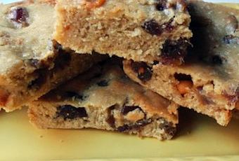 ∞ Ingredientes (para 12 cuadrados) 1 taza de harina 1/2 cucharadita de levadura en polvo una pizca de sal 3/4 de taza de azúcar moreno 210 g de mantequilla en pomada 2 cucharaditas de esencia de vainilla 2 huevos grandes de 1/2 taza a 1 taza de chispas de butterscotch (o chocolate blanco) 1/2 taza de dátiles cortados en trocitos