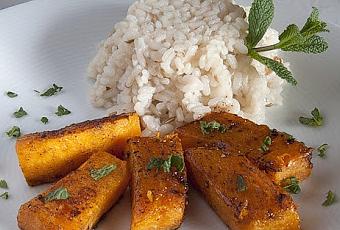- Cuando ya casi esté, agregamos la cucharada de especuloos y mezclamos bien con cuidado de no romper los trozos de calabaza. Dejamos unos minutos a fuego muy bajo para que se impregne con el aroma de las especias y servimos acompañado del arroz y con las hojas de hierbabuena picada.