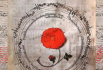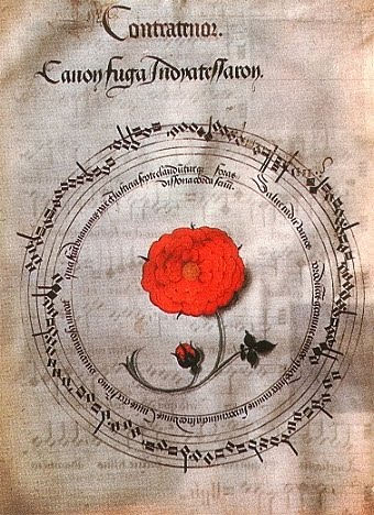 De vez en cuando, hojeo con placer alguno de los tomos de Historia de la Música Clásica de José Molina. Hoy, leyendo sobre música renacentista, encontré esta imagen de un Canon Circular en honor a Enrique VIII, y me llamó la atención cómo aparecían relacionados dos símbolos contrastantes: el círculo y la rosa.