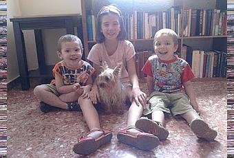 En la foto de mis niños aparece el nuevo miembro de la familia, Bart, un perrito muy pequeñito,de un año, tímido y miedoso, que no estaba muy acostumbrado al trato con humanos. Es buenísimo, no ladra, se deja cepillar el pelo, no tiene problema alguno con otros animales, (Blogui y el se llevan de maravilla). Me sigue por toda la casa y nos lo llevamos también a todas partes!.