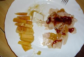 Anoche estaba yo cenando tranquilamente un plato ligero de pechuga de pavo, queso fresco, mermelada de manzana y salsa barbacoa. Entre ingestión e ingestión pensé: ¿y si le meto persimón a todo esto?