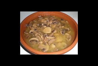 Picar finamente 1 cebolla, sal y 1 diente de ajo. Luego se rehoga en una cazuela con aceite. Posteriormente añade 800 gr de chapiñones enteros, un trocito de pimiento, 1 y 1/2 de harina y 1 vaso de vino blanco. Sazonar y espolvorear con perejil picado.Una vez finalizado, dejar cocer a fuego lento durante treinta o cuarenta y cinco minutos. El plato se presenta sobre rebanadas de pan frito en aceite y salsear.