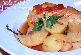 Ponemos un chorrito de aceite en la cacerola, las rodajas de papa, el pescado, salpimentamos, luego ponemos los pimientos, tomate, y cebolla. Así vamos formando las capas hasta terminar todos los ingredientes.