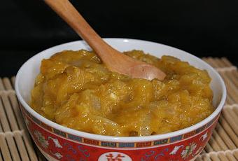 especias, mango y cebolla, es una especie de mermelada pero muy aromática. La preparé un día en casa y fue un auténtico éxito, desde entonces la preparo muy a menudo.