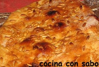 Estirar la masa sobre un papel de hornear, pintar con aceite de oliva, echar los piñones y espolvorear con azúcar.