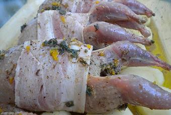 A llegado el momento de echar mano y dar trabajo a mi querido amigo de fatigas gastronómicas hogareñas; el señor mortero, jejeje porque que haría yo sin él!! Echamos dentro los dientes de ajo junto con el romero, las hojas de salvia y un buen pellizco de sal, otro de pimienta y comenzamos a majar todo bien hasta que veamos que se ha formado una pasta (el motivo que siempre uso el mortero cuando preparo los marinados es porque de esta forma se le saca mayor esencia y aroma a las hierbas aromáticas, que en vez de picarlas con el cuchillo). Luego agregamos las ralladuras de los cítricos, las cucharadas de 5 especias chinas, el zumo de la naranja y un buen chorrito de aceite de oliva para ligar todo. Removemos bien y pringamos por fuera y por dentro la carne de las codornices sin olvidarnos de ningún hueco; podéis usar una brochita si sois escrupulosos/as, aunque yo uso las manos! Dejad macerar las codornices aproximadamente 1 hora para que tomen todo el sabor.