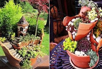 Aquí tienes algunas ideas para hacer mini jardines aprovechando tus macetas rotas: