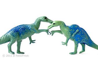 Se trata de una copia descarada del Trachodon de Marx (vedlo aquí, en dinosaur-toys-collectors-guide.com). Nos recuerda al contrahecho en las manos, ¿verdad? Pero fijáos bien: el de la izquierda es un ejemplar bien formado, mientras que el de la derecha... bueno. Está comprimido, algo hinchado, chepudo, y tiene un tumor plasticoso de forma tubular en el costado izquierdo. Parece que no salió bien del molde, pero aún así lo echaron a la bolsa. Tanto mejor porque, a pesar de sus defectos físicos, encontró el amor. Y un hogar. Y la ciber-inmortalidad.