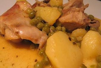 INGREDIENTES:- ½ conejo troceado- 2 dientes de ajo- 3 patatas- 1 lata pequeña de guisantes- 1 vaso de vino blanco- 1 cucharadita de pimentón de la vera- 1 cucharadita de pebrella- sal- aceite