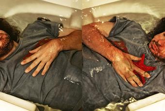 Fotografía realizada para el reto de la Familia Fotera: TRANSPARENCIAS. Personaje bajo el agua cristalina de una bañera con estrella de mar en el lugar del corazón