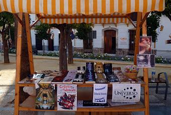 editora de Editorial Universo), Juan de Dios Garduño (escritor y editor de Editorial Palabras de Agua), Ana Coto (escritora de Editorial Círculo Rojo), Sarah Degel ("Yo soy bibliófila") y una servidora. El viaje fue largo, pero no faltó la conversación, sobre todo de literatura, y las risas, porque tuvimos que lidiar con un libro que desprendía gas somnífero (era abrirlo, empezar a leerlo y caer dormido al instante, pero no os diré el título por si se extiende el efecto) y con una casa encantada que nos dio pie a inspirarnos en maquiavélicas historias de terror en las que siempre moría al menos uno de nosotros, además de con el calor, que pegaba con ganas.Ya en Coín, tras la comida, conocimos a María González Pineda, que acaba de publicar con Editorial Universo "Con el corazón de Eva". Ella reside allí y nos trató estupendamente (mil gracias de parte de todos por todo, María).Nos dio tiempo a descansar muy poquito, ya que enseguida se nos llegó la hora de ponernos manos a la obra, así que cargados con cajas llenas de libros (llenísimas) nos dirigimos hacia nuestro stand en la Plaza de la Alameda.