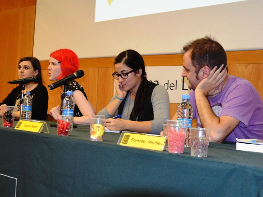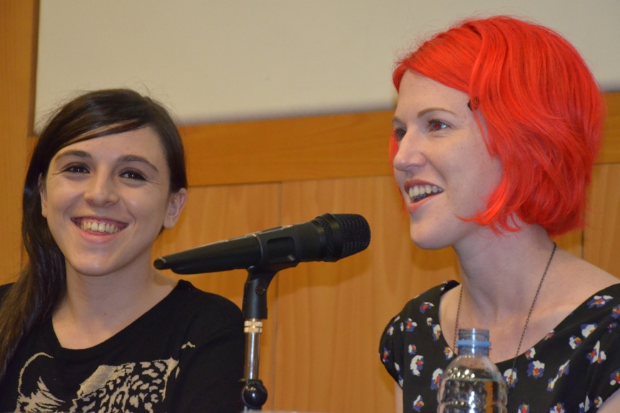Puntualmente llegaron Miriam Malagrida y Helena Pons, de Neo Plataforma, muy bien acompañadas por dos autores de lujo: la propia Stephanie Perkins y Francesc Miralles, que se encargaría de presentarla. El acto comenzó con unas palabras de bienvenida de Miriam, que agradeció la presencia de todos los asistentes y después dio paso a Francesc para que bombardeara a preguntas a Stephanie. Helena, mientras tanto, tomaba notas en su libreta, pues era quien se encargaba de hacernos una estupenda interpretación consecutiva de las palabras de la autora.