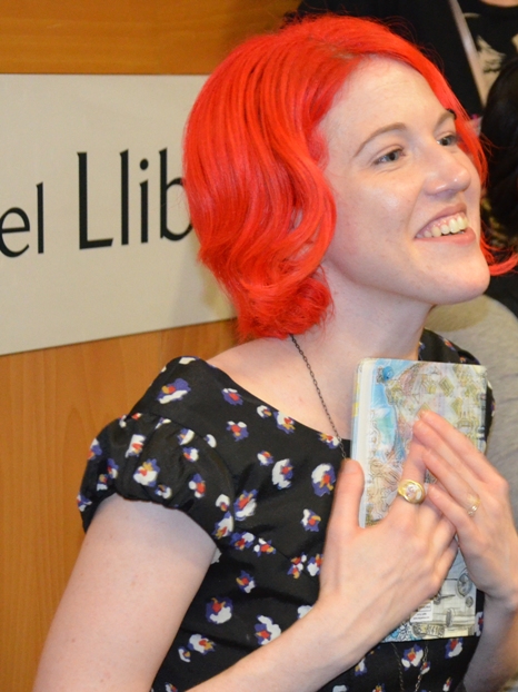Cuando se acabó el turno de preguntas, todos los que estábamos en la sala nos pusimos en pie para que nos firmara nuestros libros. Como queríamos tenerla solo para nosotros (somos unos acaparadores), nos esperamos hasta el final para ponernos en la cola. Cuando por fin nos llegó el turno, aprovechamos para regalarle una libreta de recuerdo de Barcelona, con dedicatorias de algunos de nosotros. Por su sonrisa, parece que le gustó mucho.