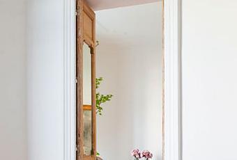 "Los elementos del baño se han diseñado como piezas exentas que exhiben sus materiales -mármol griego y teselas doradas- y dialogan con la sencillez de los materiales de la casa. Se crea un espacio ecléctico y diverso, donde la madera lavada del suelo y las paredes desnudas acogen, además, una selección de antigüedades y árboles con una intención de atemporalidad."