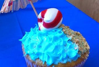 Tenemos estos primeros cupcakes en los cuales vemos se ha hecho una decoración con temática playera, se han decoración usando crema, con ella se ha simulado el agua y arena del mar, esta idea es genial para una fiesta de playa, aquí veras con que se decoran los cupcakes.