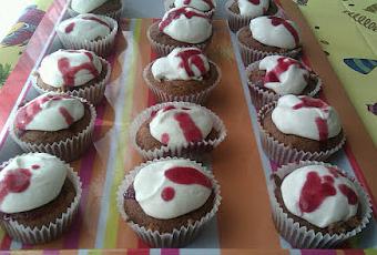 Montamos los cupcakes de la siguiente manera: con la manga pastelería rellenamos los cupcakes con mermelada y cubrimos con el yogur que habíamos preparado antes (tiene que repasar un par de horas en la nevera).