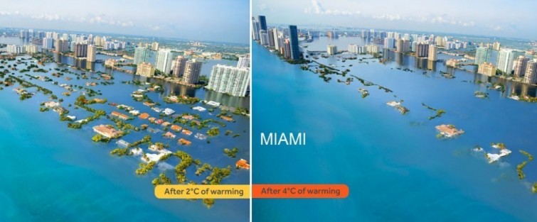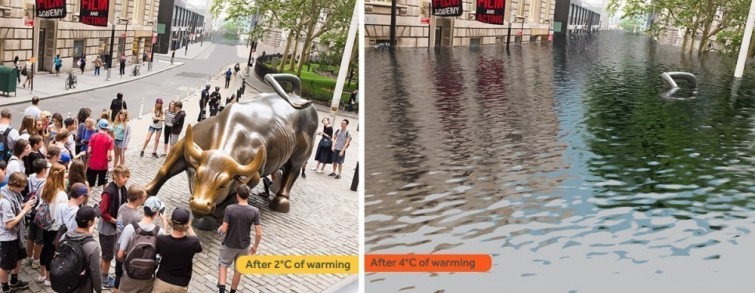 Las imágenes dejan ver, por ejemplo, que si las temperaturas promedio aumentaran en solo 2°C, las playas de Miami Beach ya no podrían llamarse playas; o que el toro de Wall Street, imponente atracción para quienes caminan por esas calles, quedaría tapado por el agua casi por completo... y solo se salvaría su cola.