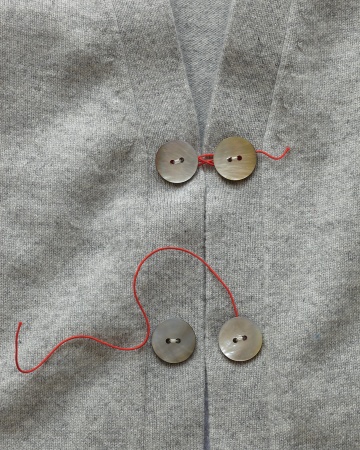 En esta primera opción cose unos botones grandes tapando el ojal de uno de los lados y colocar una cinta de color vistoso para hacer un pasador.