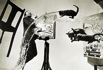 Tras 26 intentos y cinco horas de trabajo, la composición por fin quedó al gusto de Halsman. Mientras la mujer del fotógrafo sostenía la silla, varios ayudantes lanzaban un cubo de agua y los tres gatos, al tiempo que Dalí saltaba. El resultado es un apurado pintor que sufre por encontrar su sitio en la instantánea y una curva de agua que parece una vía sólida de hielo por la que uno de los felinos se desliza.
