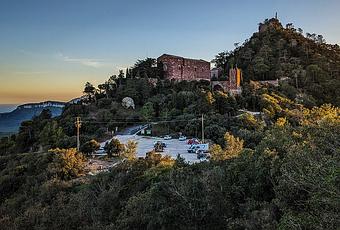 Vista del Castell-Monestir d’Escornalbou desde el camino de subida al Turó de Puigferrós. Arriba del todo la ermita de Santa Bàrbara d’Escornalbou, a 641 metros de altitud. La ermita se levantó sobre los restos de una torre romana, utilizada por los árabes como lugar de vigilancia.