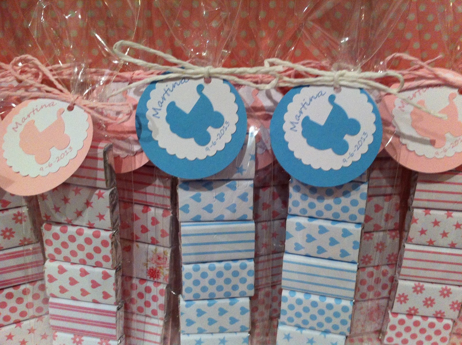 Tenemos....unos paquetitos de chocolatinas decoras en rosa unos y otros en azulito Para las etiquetas hemos puesto el carrito troquelado